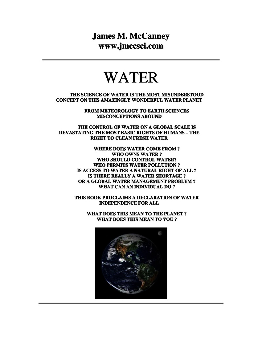 The eBook water is an expose on the current condition of available fresh water in the world. The conclusion is that we do not have a water shortage problem but a water management problem. This is a quick read for those interested in discovering the history of how we got to this condition and possible solutions.